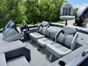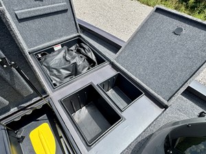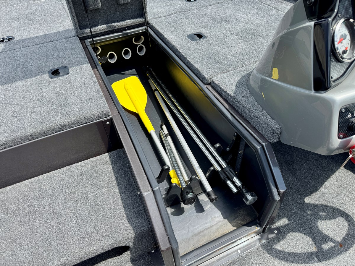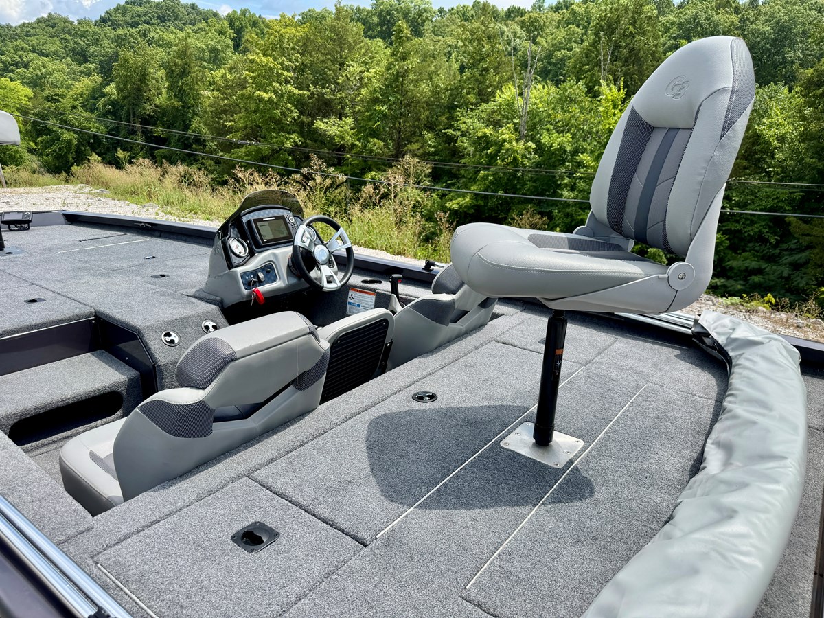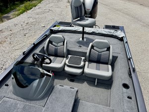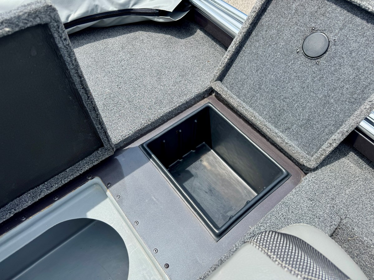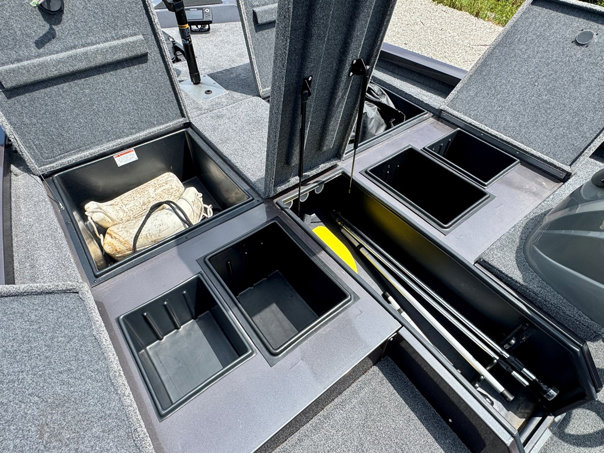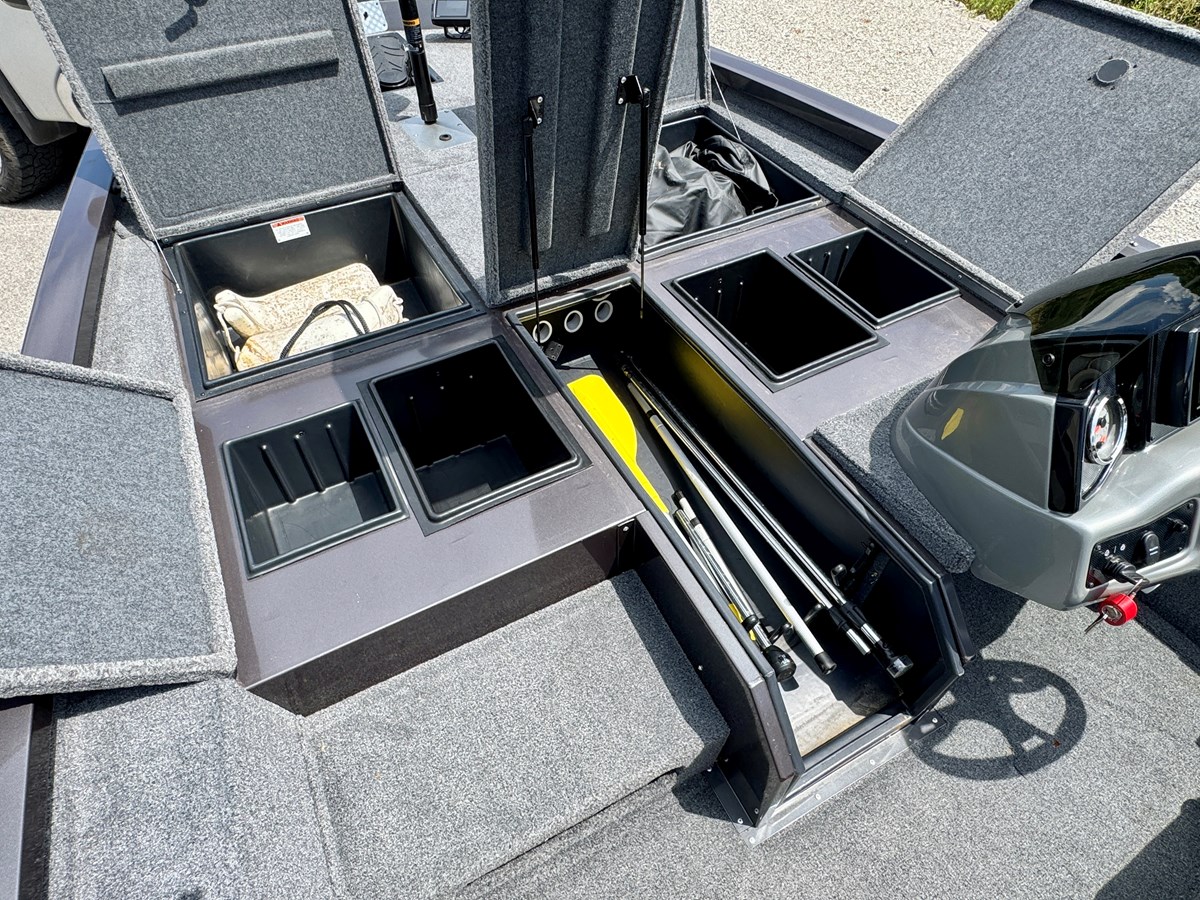 A 33-gallon divided livewell is automatically aerated and flanked by twin tackle-storage boxes. A large aft hatch gives access to the batteries, engine rigging, and an optional three-bank charger.