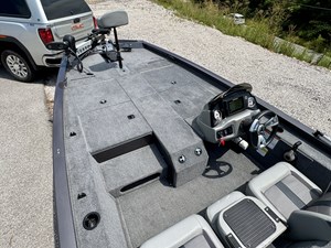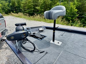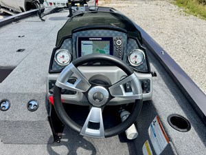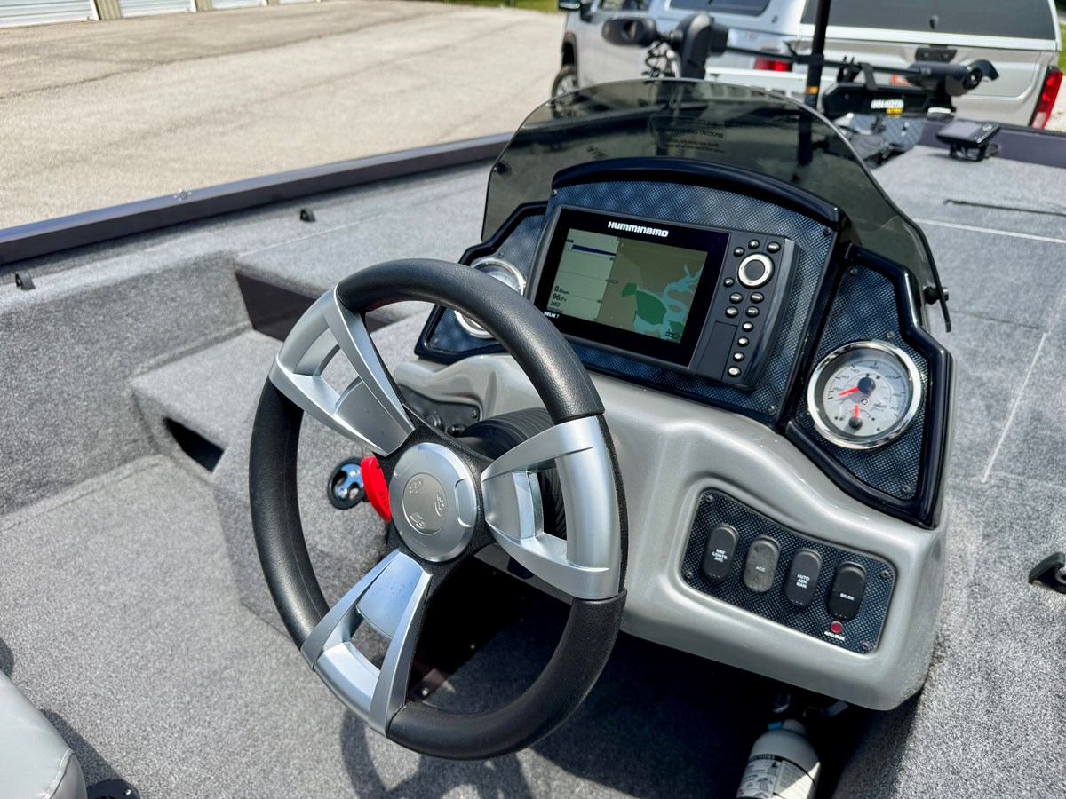 The Sportsman has a thick, 0.100-gauge aluminum all-welded hull. The bow features large dry-storage boxes as well as tackle-storage lockers flanking the center rod locker. Our tester was equipped with an optional MinnKota Ultrex trolling motor; a Maxum 24v 70-pound thrust troller is standard. The Helix 9 CHIRP on our dash was an upgrade (5-inch is standard); the 9-inch Helix at the bow is optional.