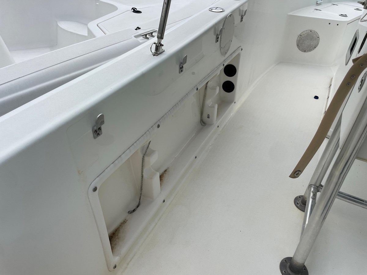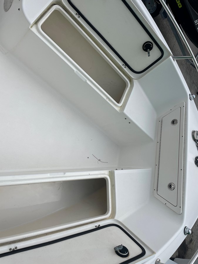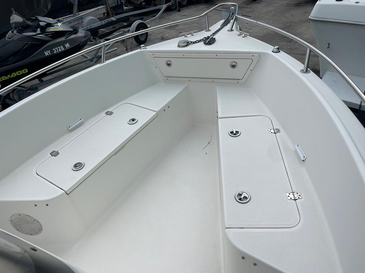 Pleasant surprises abound on the Century 2300 Center Console. Designed by fishermen for fishermen, this boat has all the features serious anglers expect, and even some they don't - like the head compartment, equipped with a sink and hidden behind the swing-away seat at the front of the console. The 2300's compact and efficient helm station features a windscreen with a stainless steel console rail and complete instrumentation. The easy-access 15-gallon aerated baitwell is molded into the transom. Put a catch on ice or store dry gear in either of the two fold-top insulated bow storage compartments. The Century 2300 Center Console is rated for a single outboard of up to 250 horsepower.