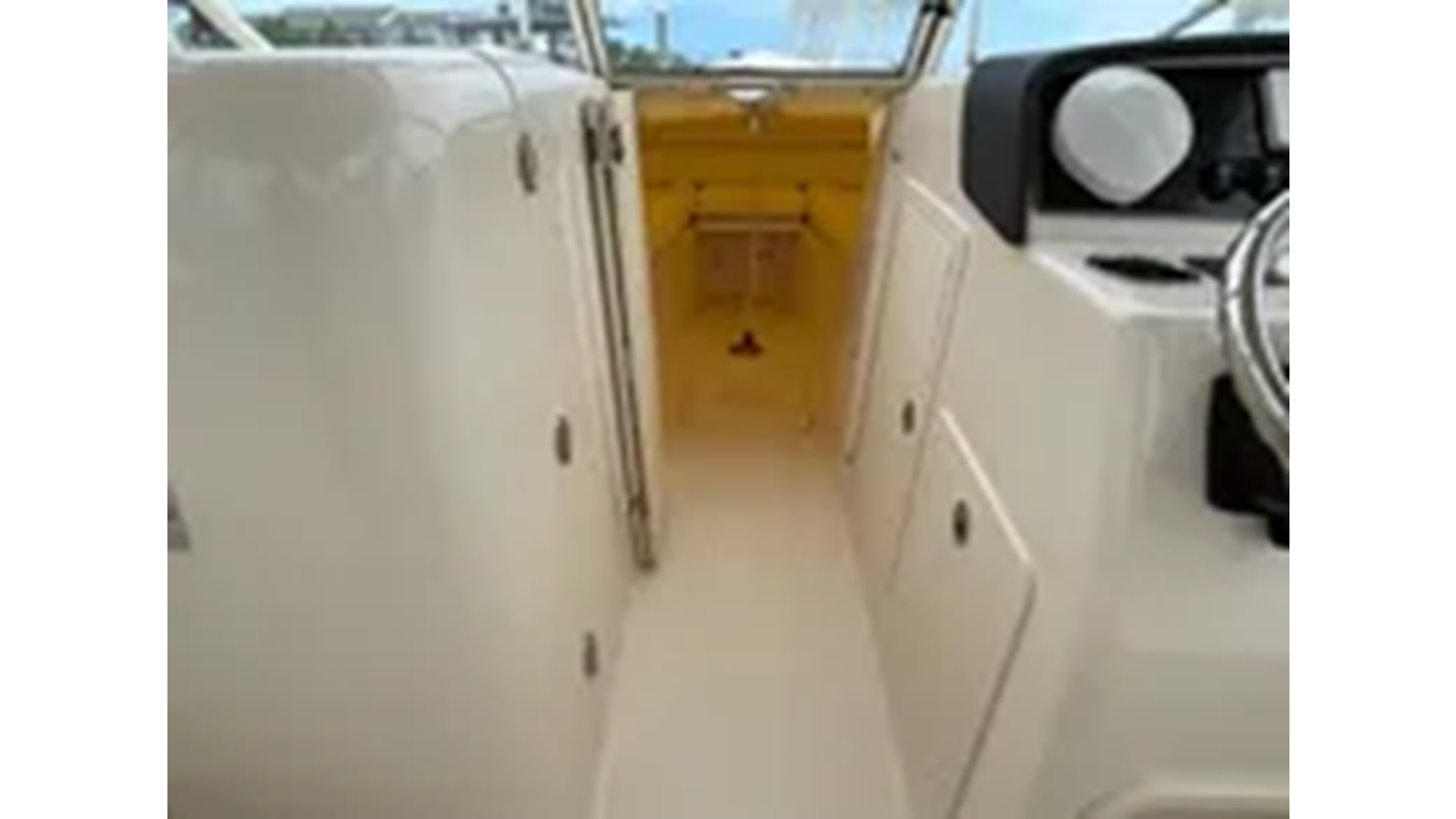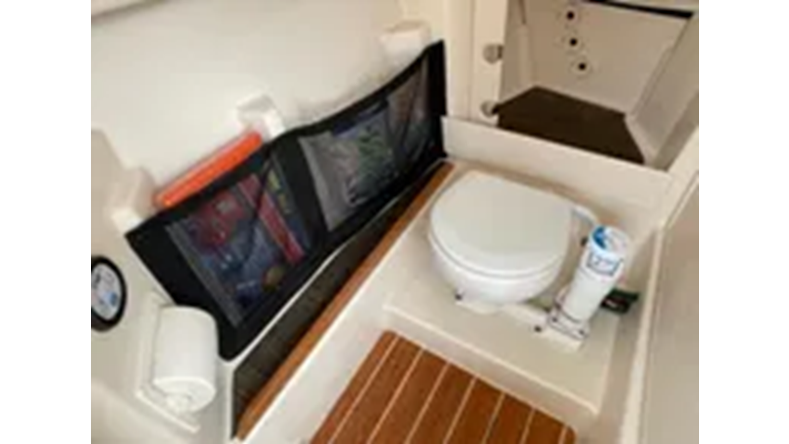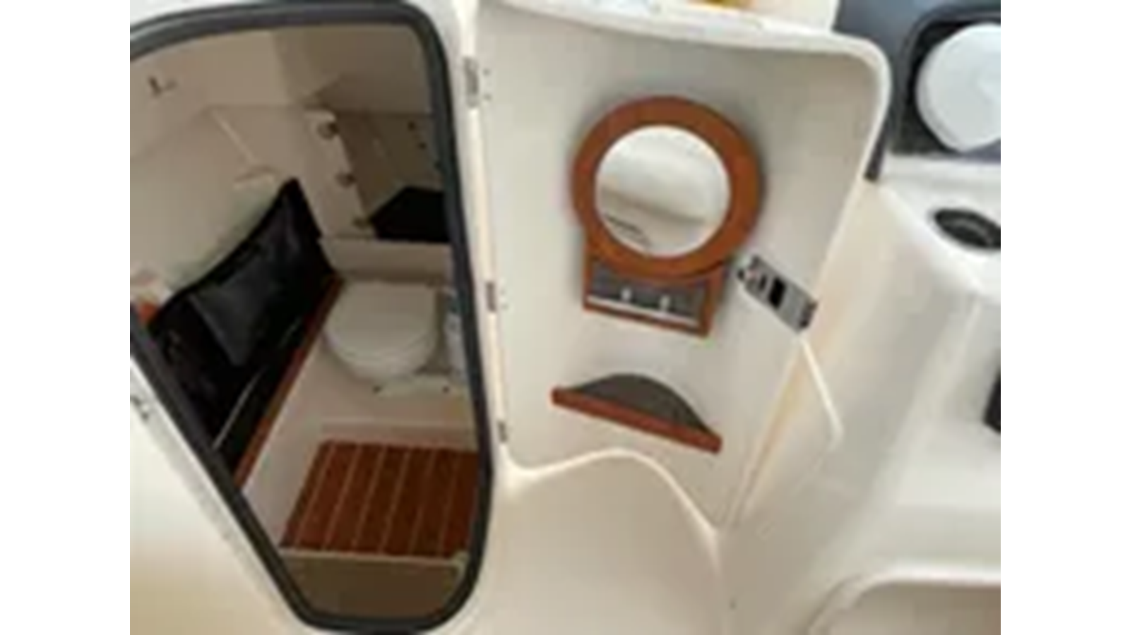 Head - lockable port console w/dome light, bulk storage, mirror w/shelf, composite cherry & holly sole, sink & marine head w/electric flush, 10-gallon (38 l) holding tank w/macerator, overboard discharge & deck pump out