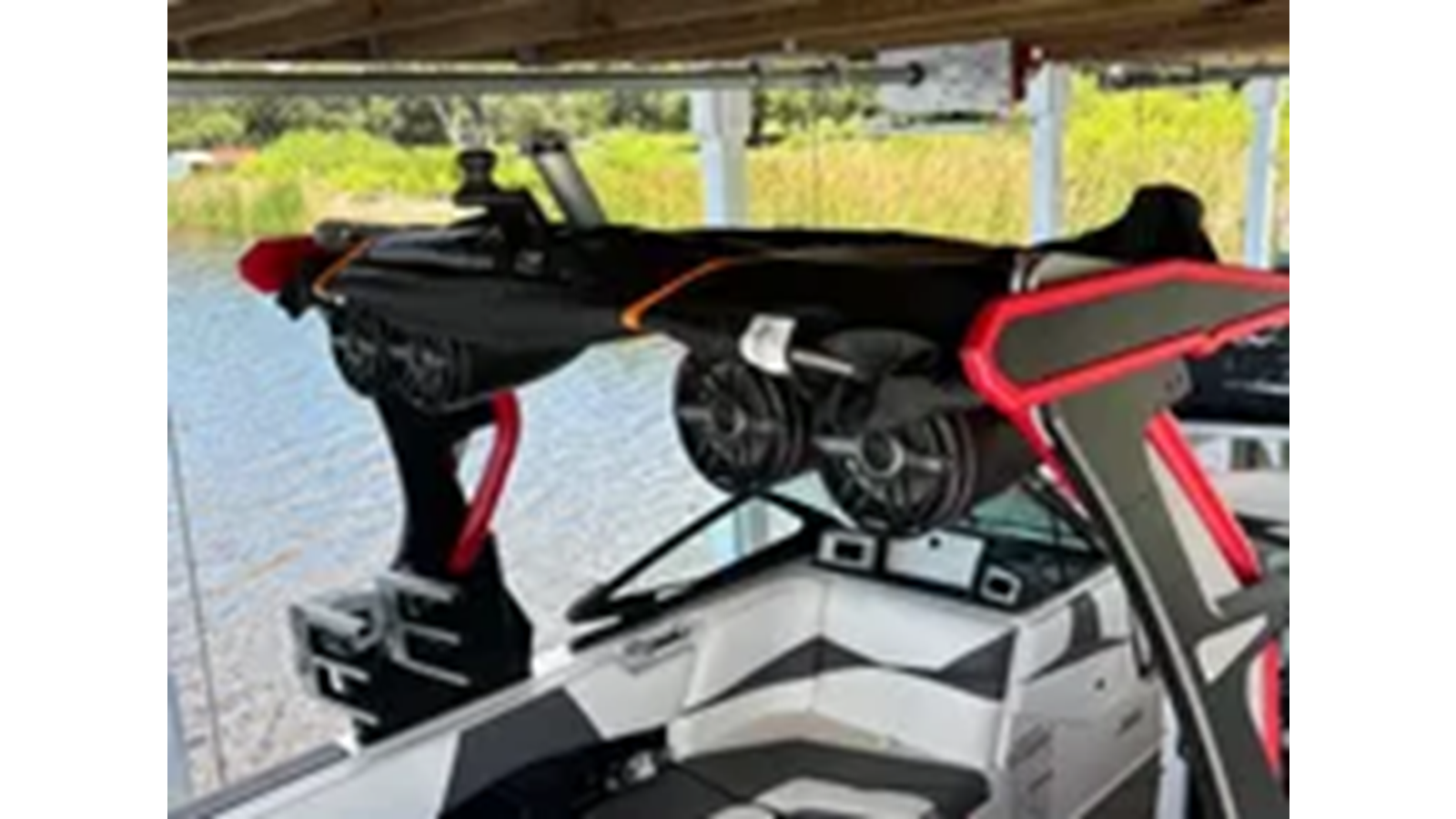 Tower: The Supra SL450 comes with a robust wakeboard tower, which includes integrated racks for boards and a bimini top for sun protection.