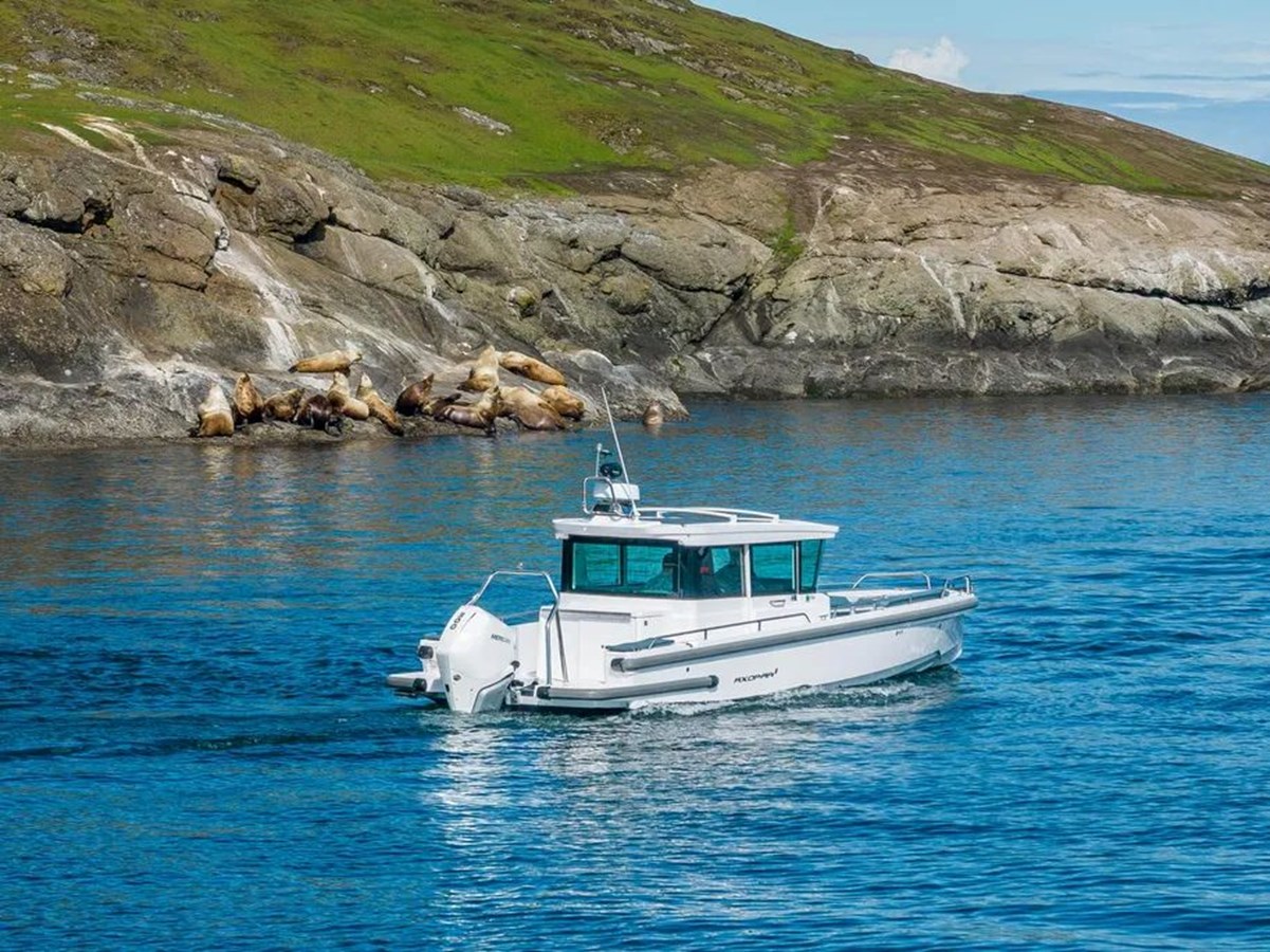 Hand laminated hull in Vinylester resin for the first coat for osmosis prevention of the hull in GRP material, Twin-stepped hull w. “sharp entry bow”, Integrated engine bracket in hull for outboard engines, Fixed aluminum fuel tank 280l w. overflow prevention, Fuel sensor Vema, Heavy-duty rub rail w. rubber end caps in grey, Heavy-duty rub rail around swim platforms, Axopar 3D signature chrome logo on both sides of hull, Bow thruster tunnel preparation in hull, Walkaround deck layout w. open aft deck, Anti-skid finishing on working deck areas and deck hatches, Self-draining deck area w. quick drain aft deck, Self-bailing cockpit & helm area, All hardware, pulpits, locks, hinges, filler caps & cockpit grab rails in 316 stainless steel, 6 x cleats on aft, midships and fore deck, Additional hooking points for safety harness around side deck areas, Side rails, Spacious anchor locker w. drainage in bow, L-shaped bench with storage on fore deck, Cupholders on both sides of the L-sofa in bow, Toughened glass windscreen and side windows in light green tint w. illuminated 28 signature, Fully enclosed cabin w. lockable sliding doors, Roof structure in white GRP w. large opening canvas roof, Harbour cover for opening canvas roof, Heavy-duty pantograph windscreen wiper, Twin fender storages on aft deck w. insulation /cooler boxes, Aft deck w. storage compartment, Lightmast, removable, Flagpole, Signal horn, Two electric bilge pumps w. auto-function, Manual bilge pump for aft deck section, Integrated swim platforms and telescopic bathing ladder, Integrated LED navigation lights.