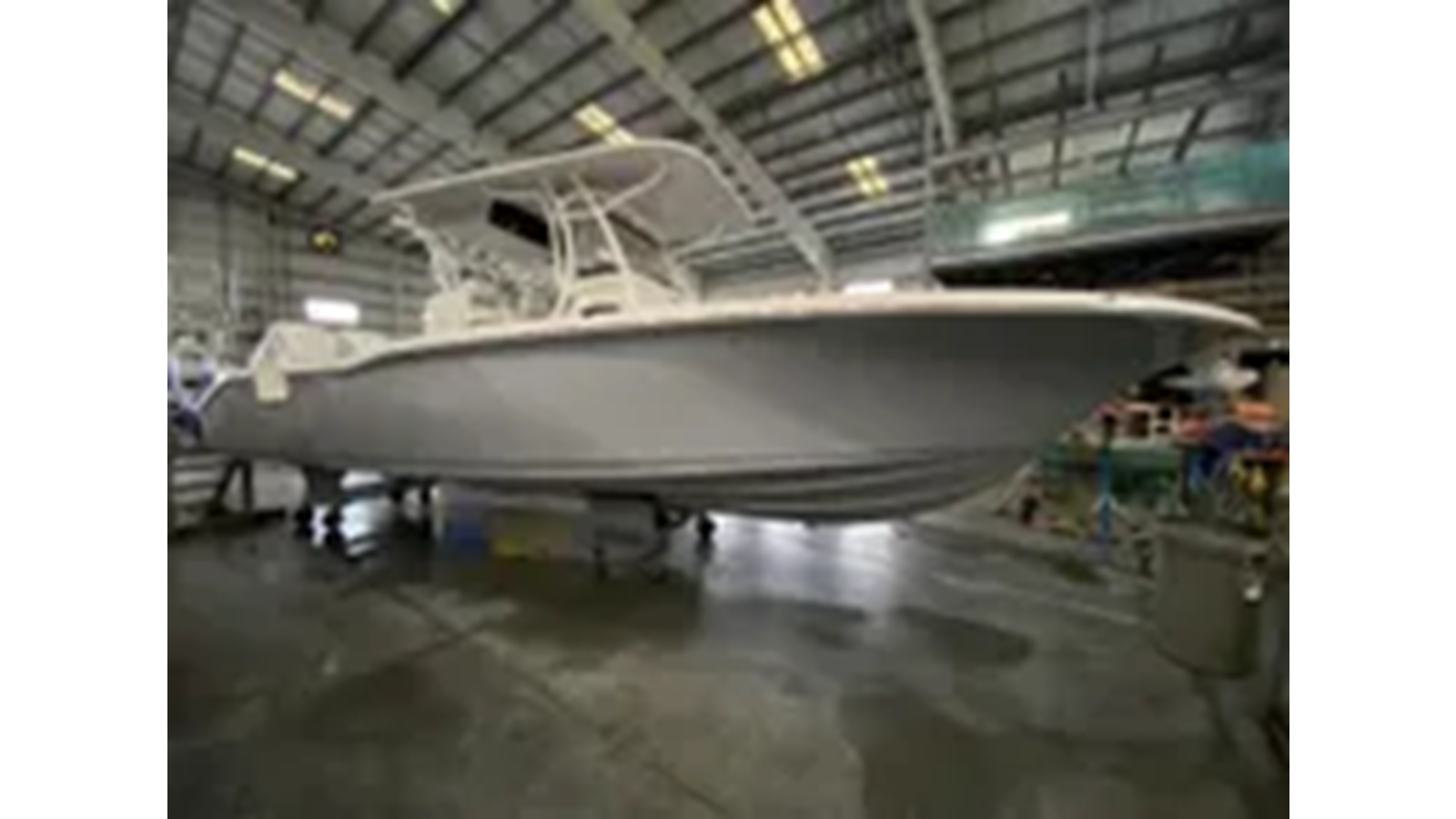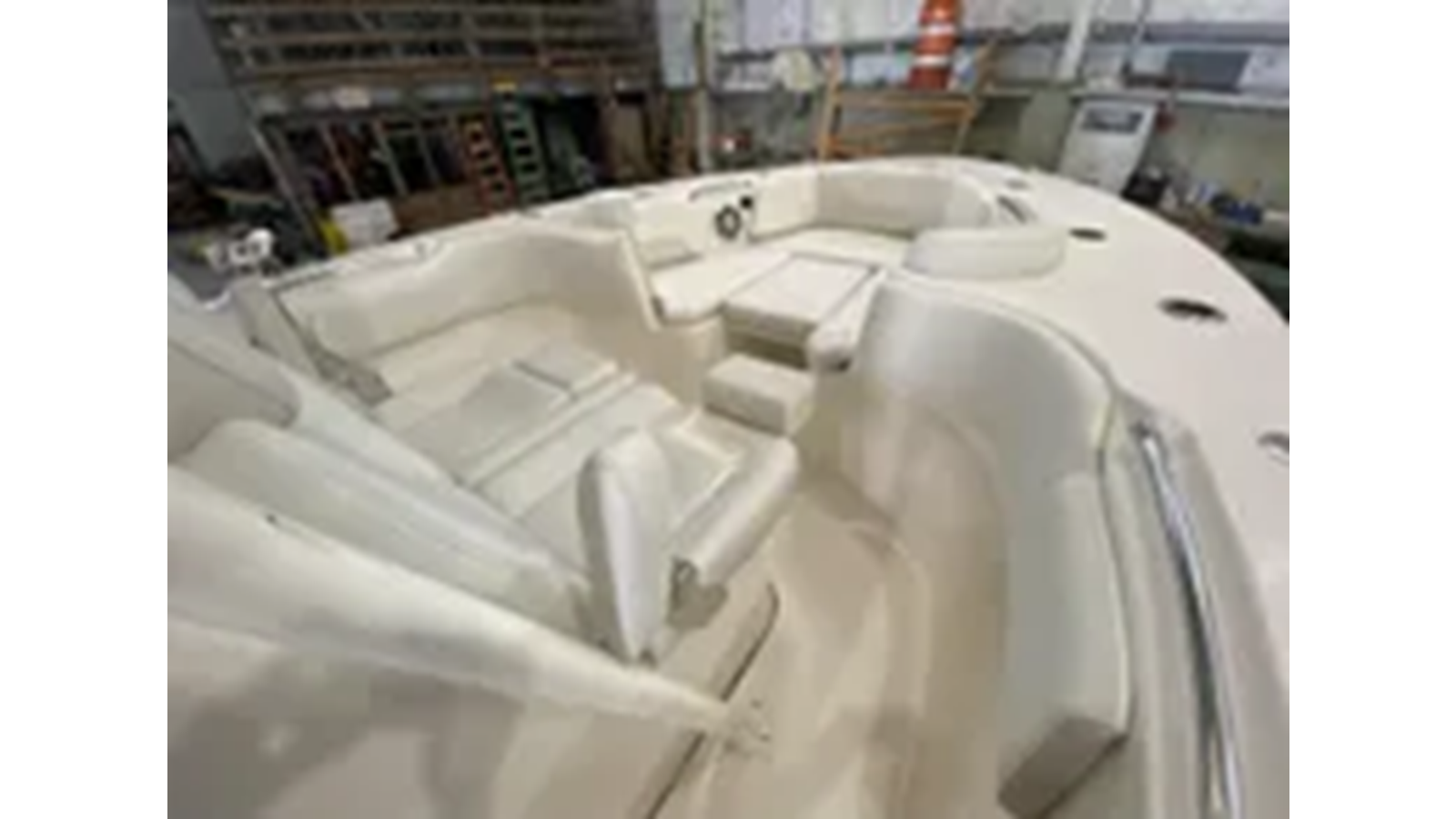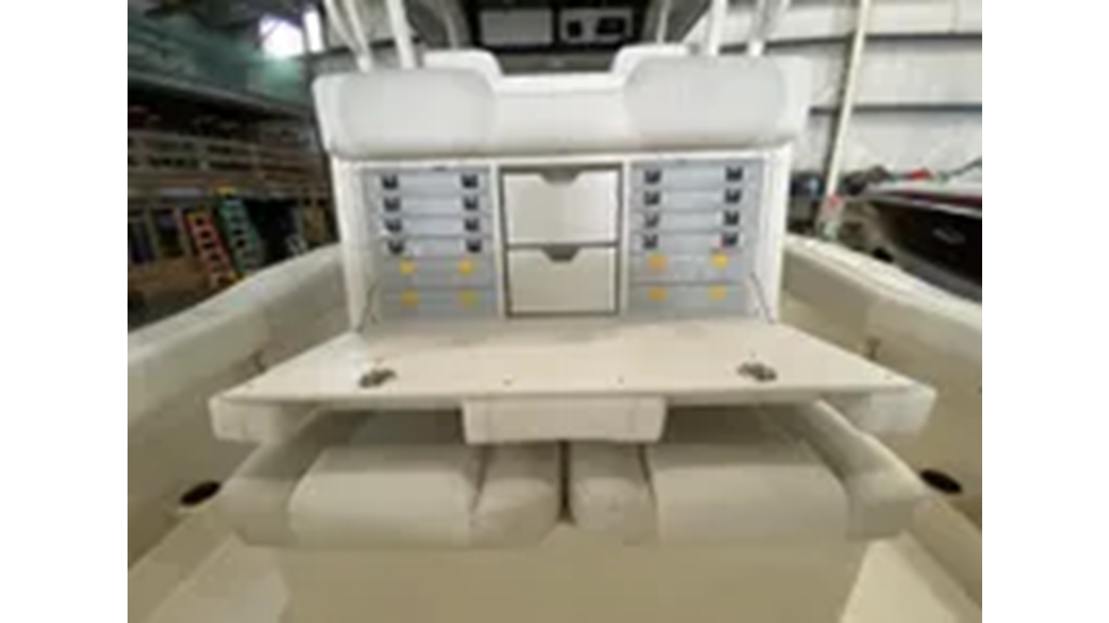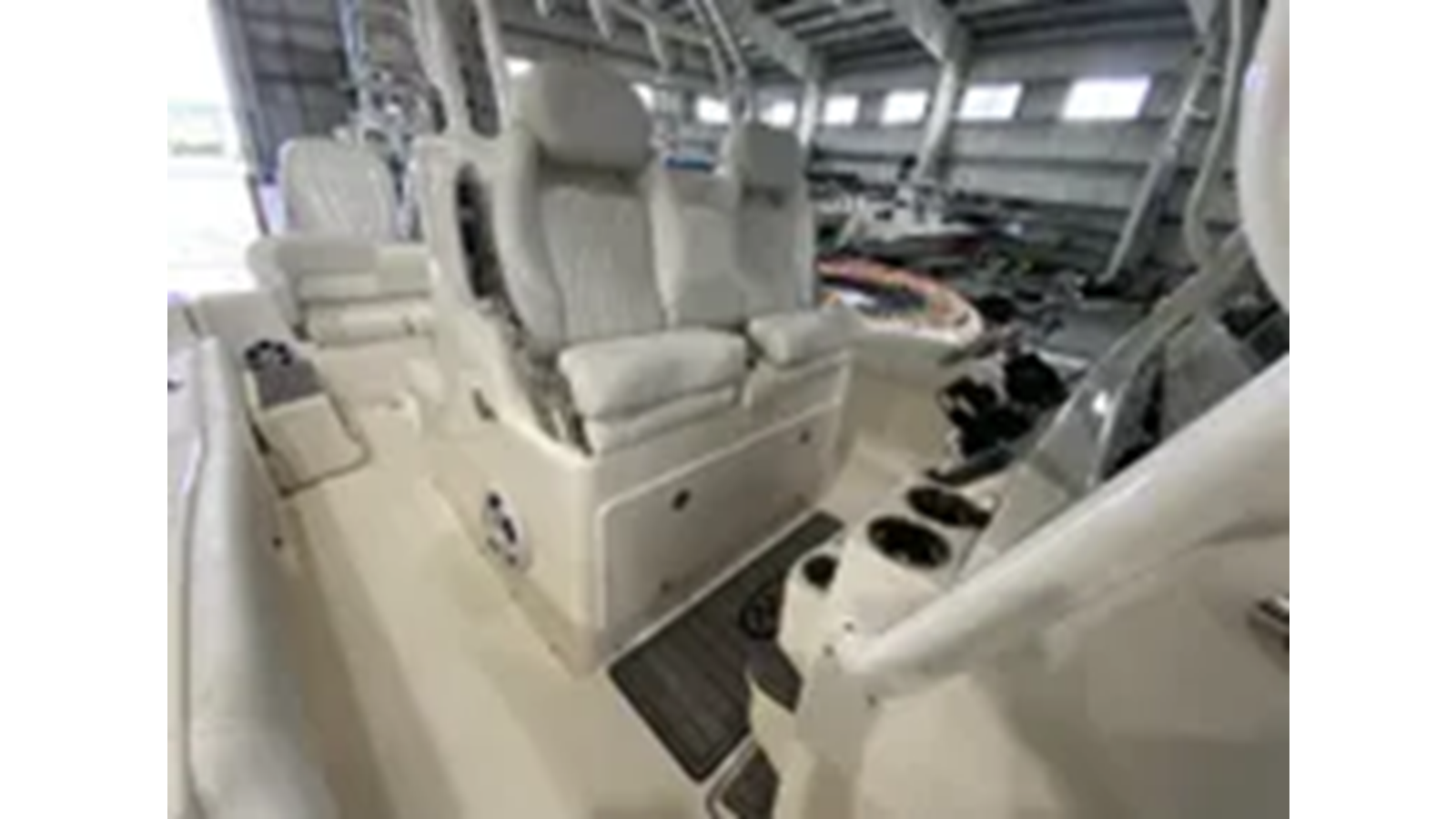 The vessel comes standard with an underdeck windlass, fuel fills on both sides, and side entry doors on each side; one with a hidden ladder and one with a beach anchor. For creature comforts, it is outfitted with wraparound bow seating, slide-out lounge seats on the console front, a lined console interior with a freshwater sink, and a huge dash space for a custom instrument layout. For fishing, it offers dual live wells, large molded-in rod storage racks, plenty of rod holders, an under-deck macerated fish box, and even a Seakeeper option.