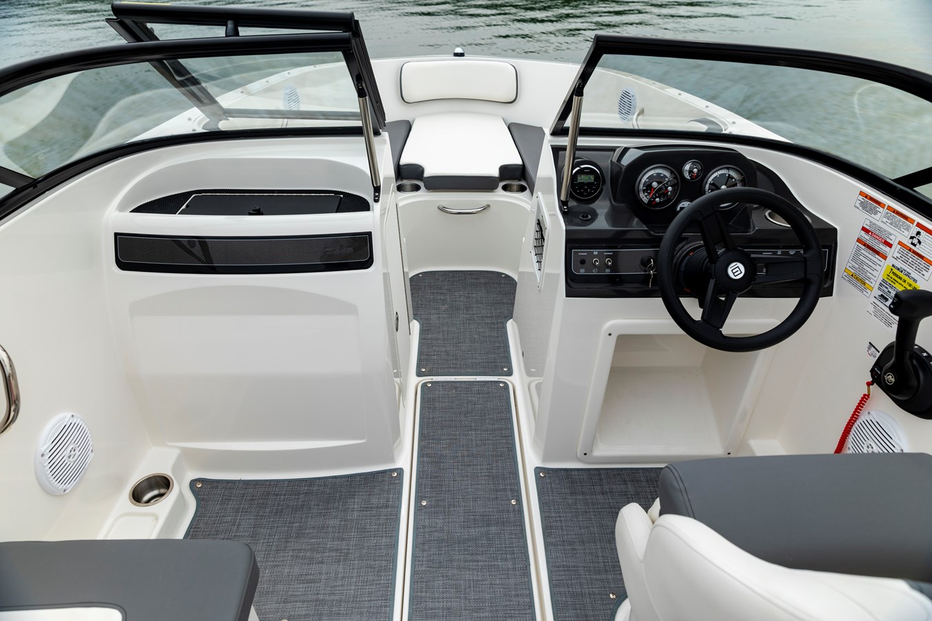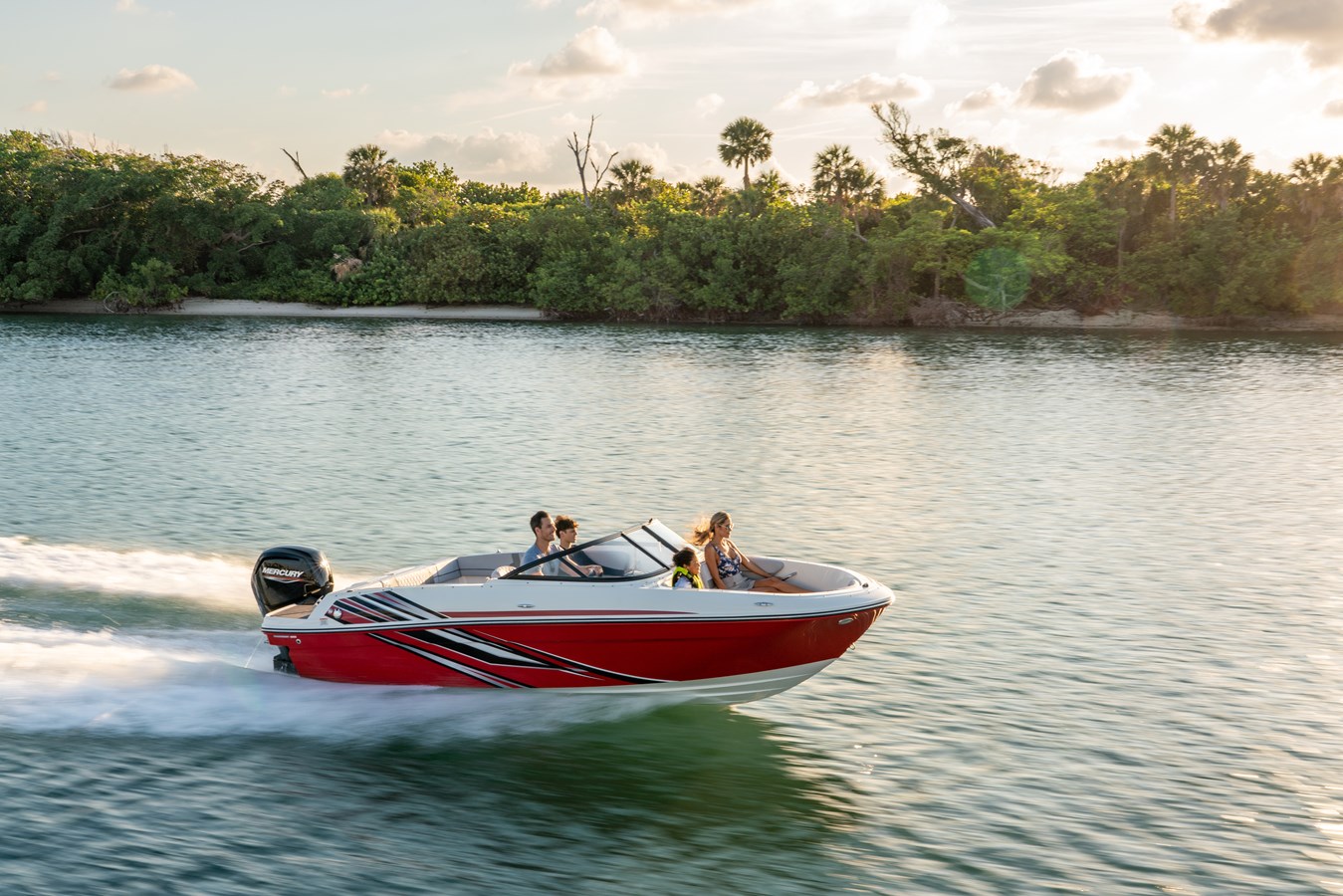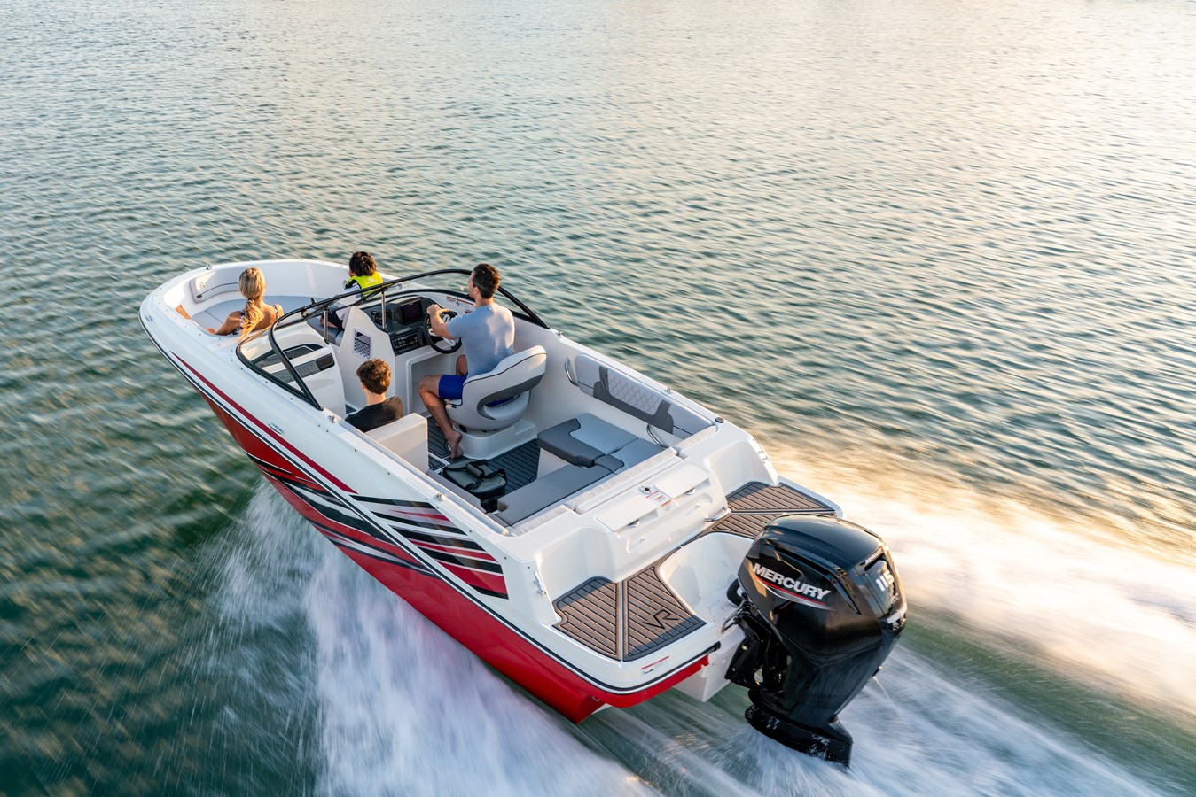 Powered by a 115HP Mercury outboard, the VR4 accommodates up to six passengers and offers options like a wakeboard tower, fishing package, and digital helm displays. With a dry weight of 2,822lbs and a 33-gallon fuel tank, it's easy to tow and perfect for day trips and watersports.