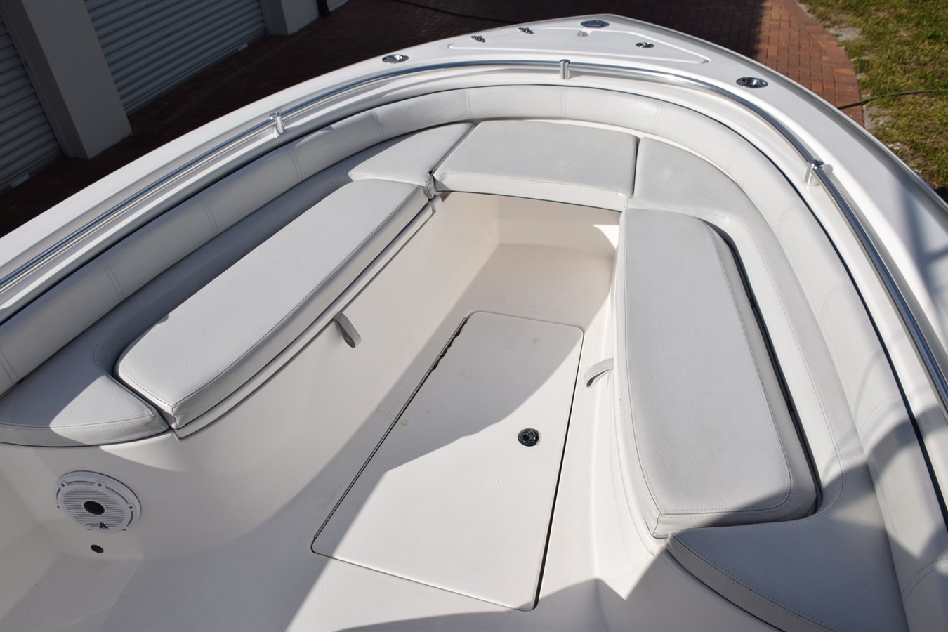 The Contender 22 Sport not only comes standard with forward and aft seating but also has a step-down console with plumbed electric head. Built with the fisherman in mind also with a 26-gallon transom livewell, 3 large fish boxes, and plenty of insulated storage and rod holders. A flat, clean shearline - the gunwale top is clear of anything to snag a fishing line.
