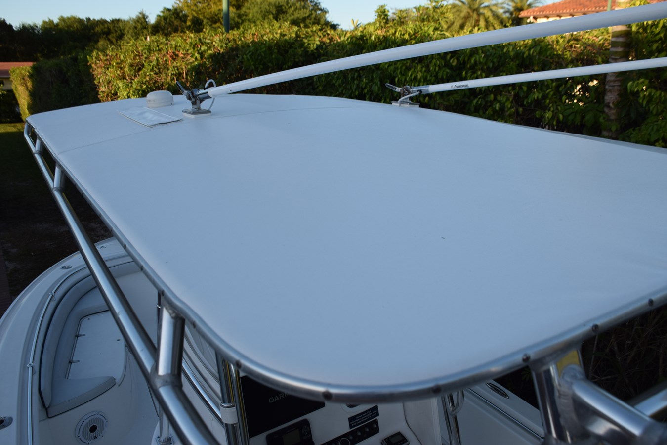- Aluminum framed T-Top with surrounding safety railing, brand new lace-less white canvas top with flap opening for stand-up rod storage to portside of console and florescent light beneath