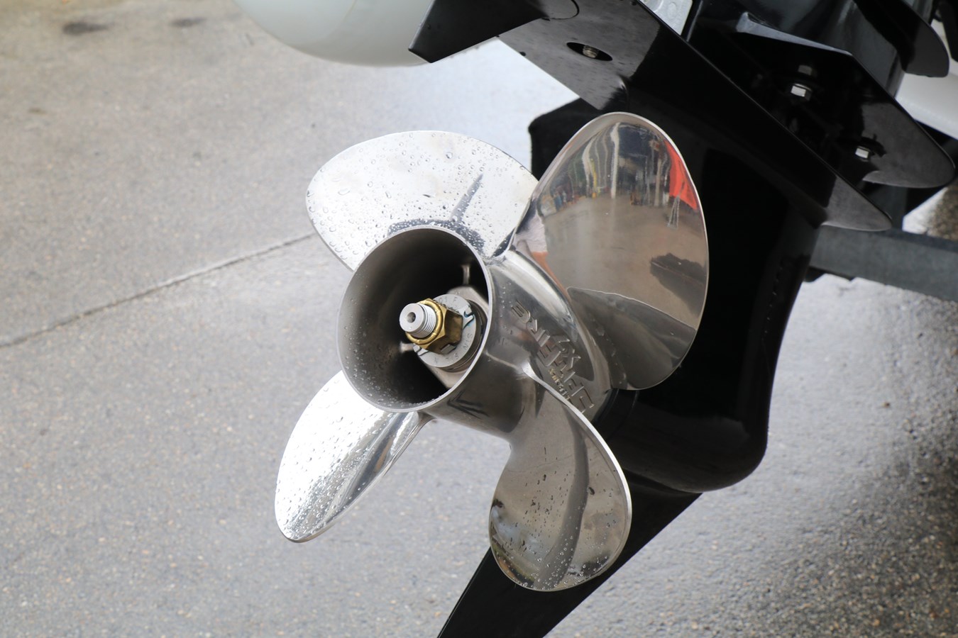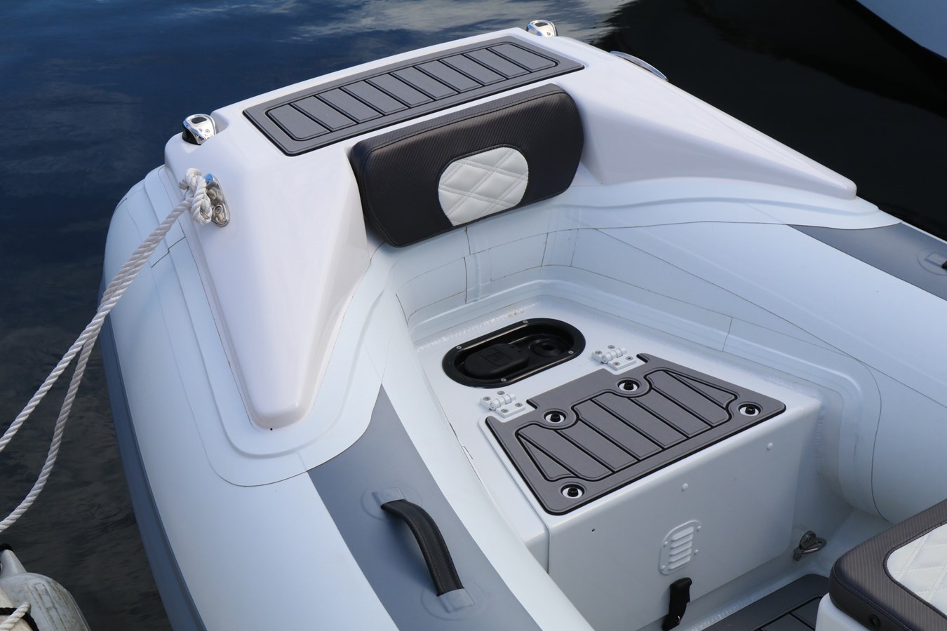 The 2023 Highfield SP390 is a premium 12'10" rigid inflatable boat (RIB) designed for versatility and performance. Built with a high-tensile chromated and powder-coated aluminum hull, it features welded lift strakes, ensuring a stable and dry ride even in challenging conditions. The boat is powered by a 50hp outboard motor and includes an integrated 8-gallon fuel system, making it ideal for use as a luxury tender or for recreational day trips. The deck is finished with EVA brushed foam teak, providing a stylish and durable surface. For storage, the SP390 offers three compartments with hydraulic-assisted lids, and the boat is rated for up to 7 passengers.