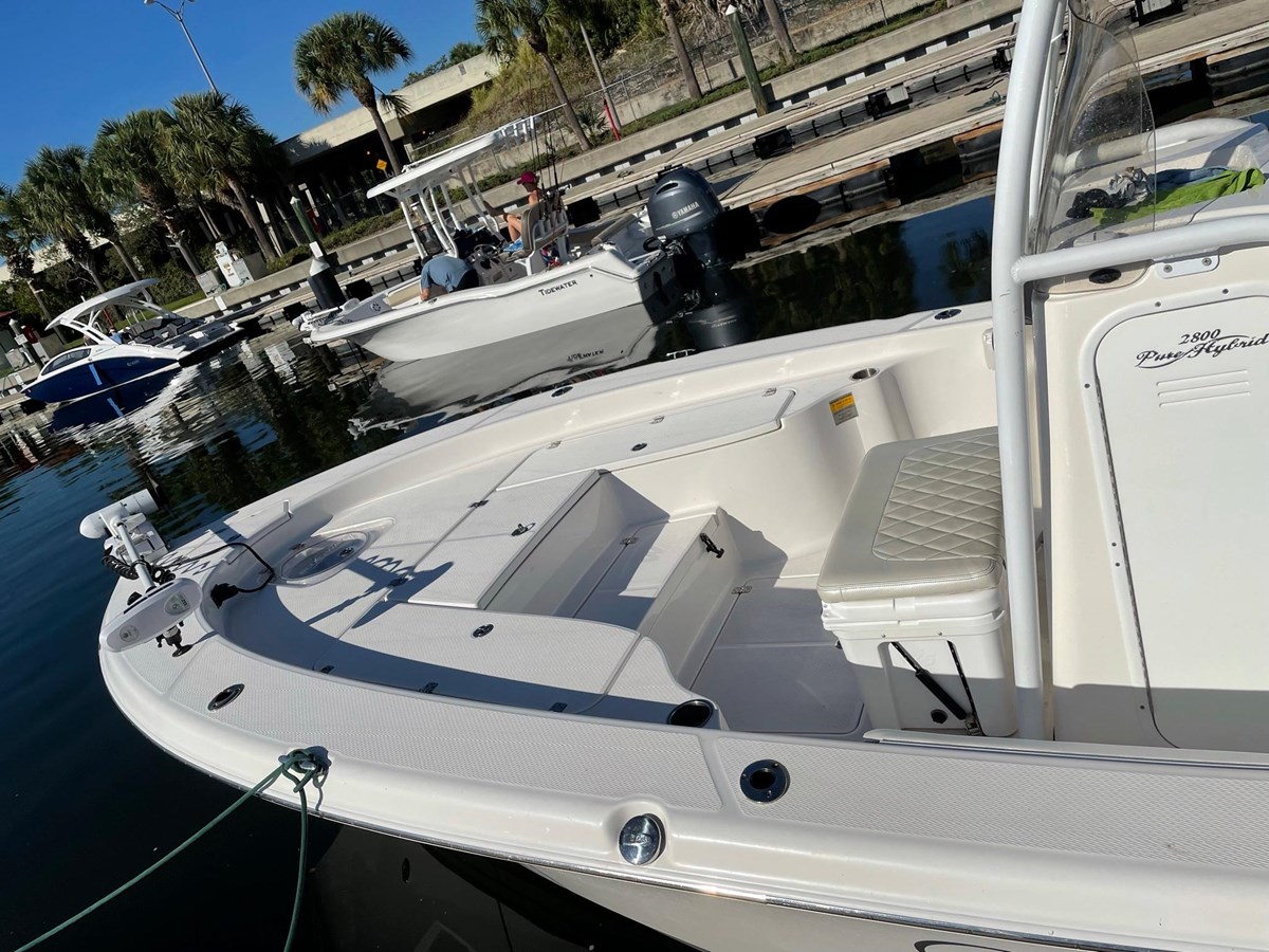 Your crew will cruise in comfort with features such as a console designed to step down inside allowing enough room for a porta potti, optional bow seating with removable back rest, an aft deck flip up seat and walk around gunnels. Some of the features that make the 2800 Pure Hybrid the smartest in its class are fuel fills on both port and starboard sides, a large wet storage area for cast nets and bait buckets along with easy battery access.