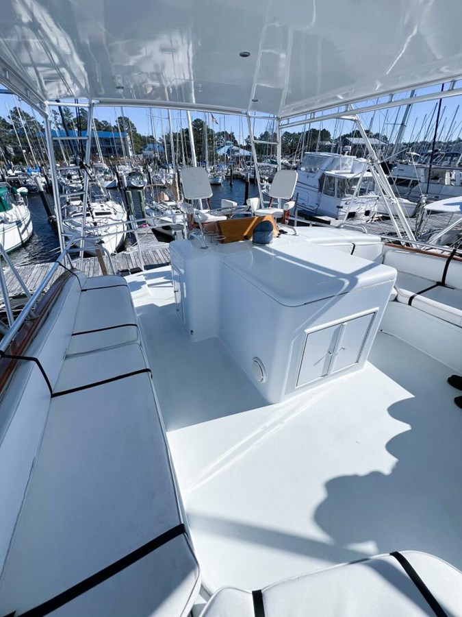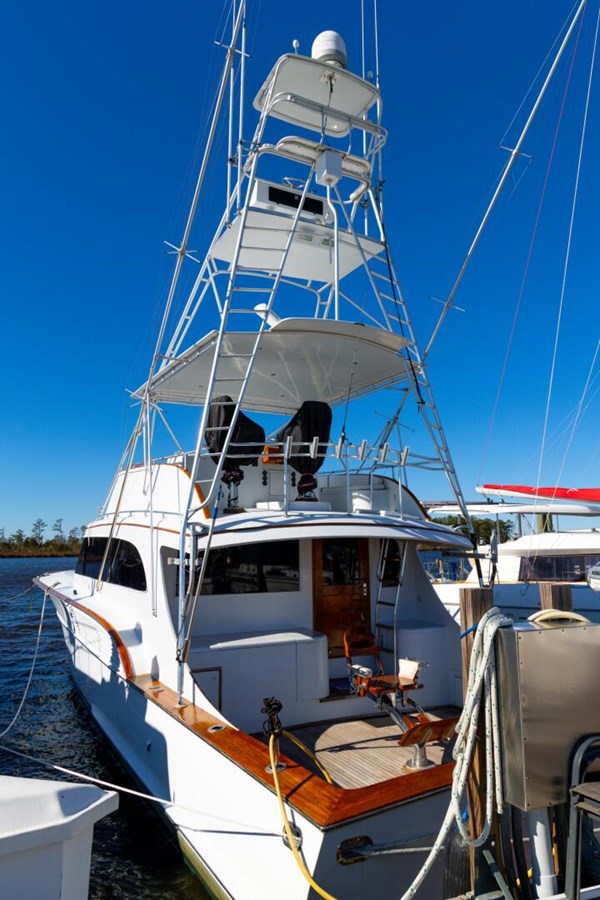 - Tower with buggy top, teak fighting chair, tuna tower, and electric teaser reels.