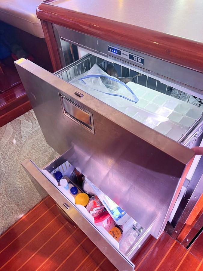 - Galley: Equipped with white Corian countertops, teak cabinetry, SubZero fridge/freezer, 4-burner stove, microwave/convection oven, and more.