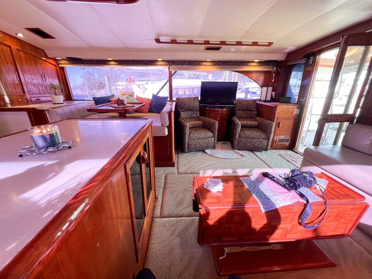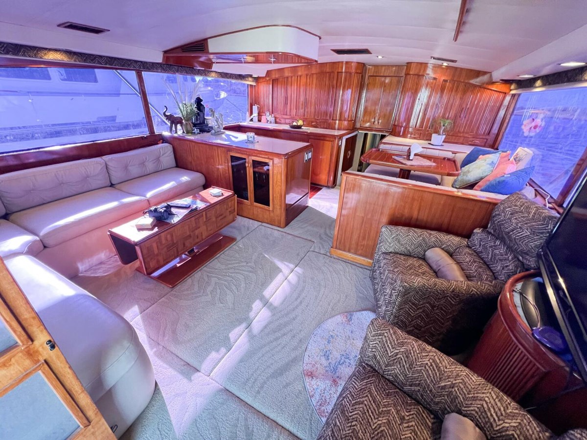 - Salon: U-shaped galley, face-to-face dinette, two barrel chairs, wet bar, and a large L-shaped sofa with storage beneath.