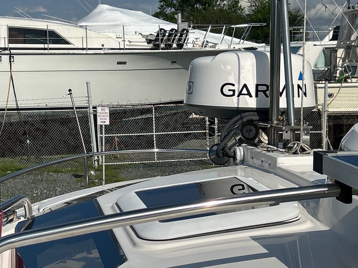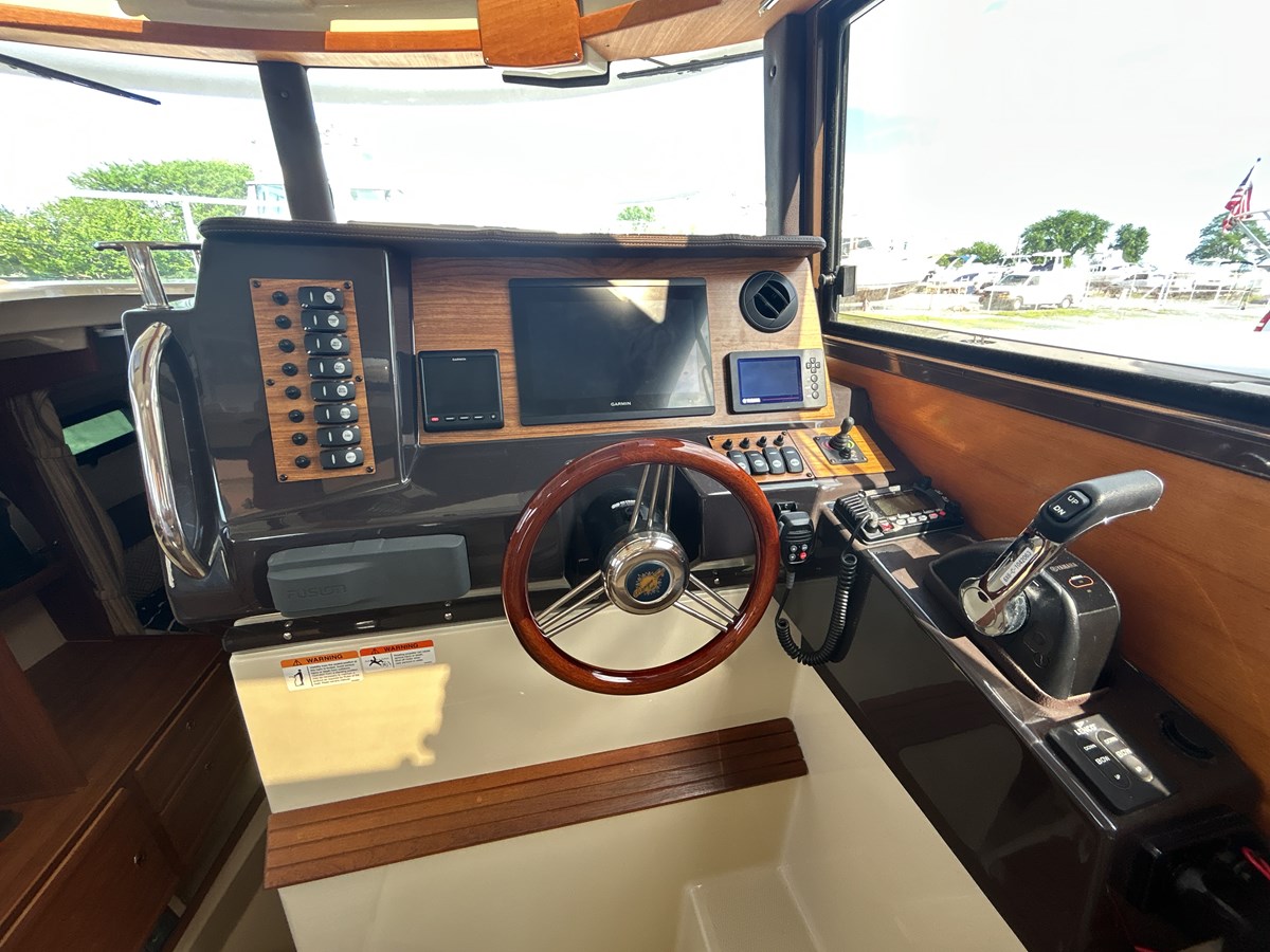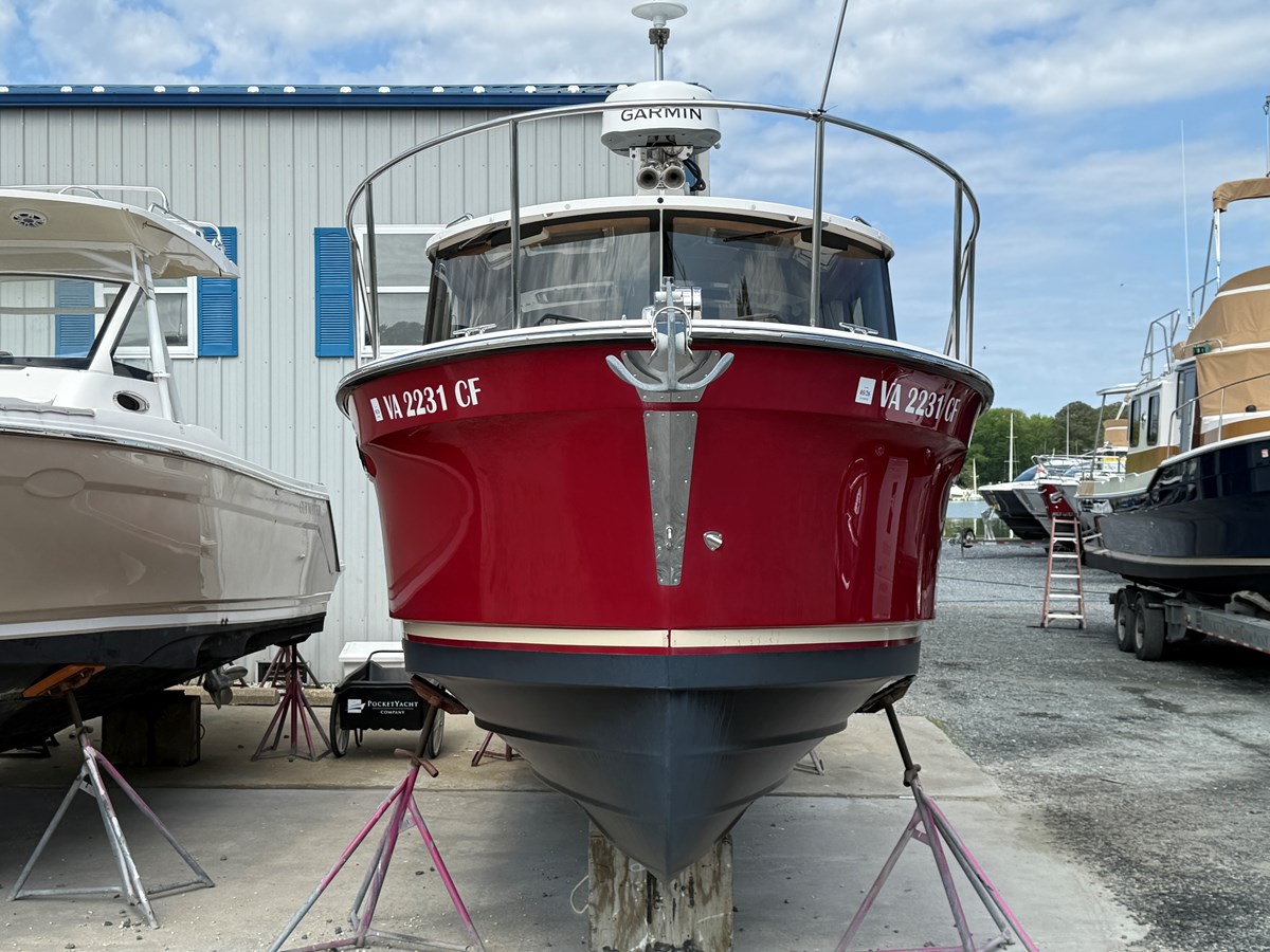Compact enough for a standard 8′ 6″ trailer yet loaded with big-boat comforts, this single-owner R-27 pairs a 300 HP Yamaha F300 with Ranger Tugs’ deep-V hull for a quick 30 kt cruise and 42 kt top speed. A bow & stern thruster package, Garmin 8612xsv navigation suite (radar, sonar, autopilot) and hydraulic steering make docking effortless, while 150 gal of fuel, 40 gal of fresh water and 30 gal holding let you stay off-grid for days.