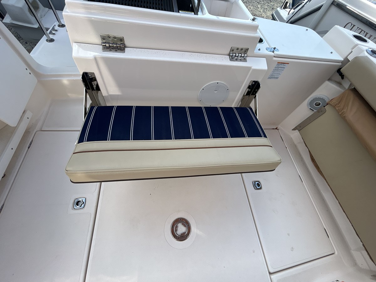 Self-bailing cockpit: flip-out gunwale seats, raw/fresh washdowns, insulated storage, and a transom gate to the extended swim step.