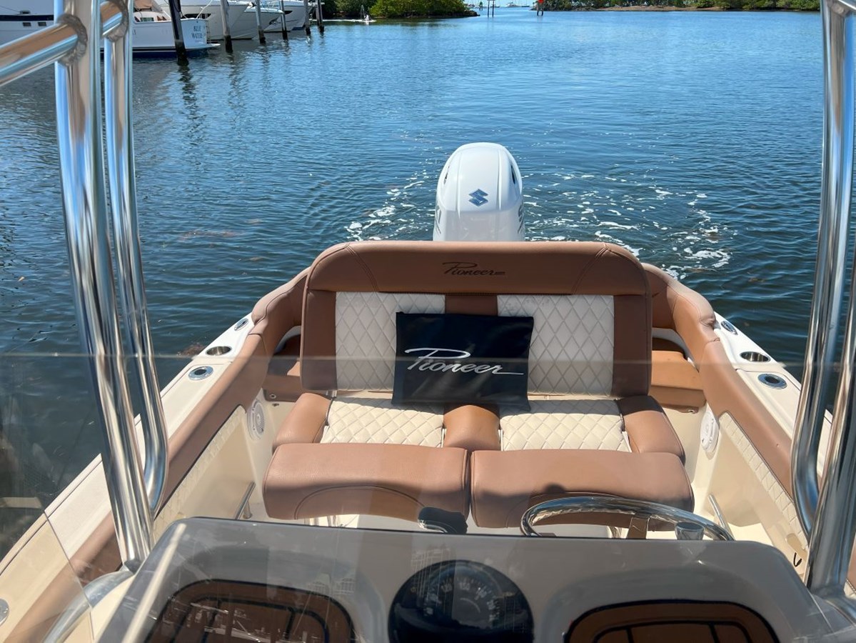Powered by a 150 HP Suzuki outboard engine , the Pioneer 202 Islander offers an efficient cruising speed of 27 mph and an impressive top speed of 41 mph , making it ideal for fishing trips, water sports, or weekend cruising. With seating capacity for up to 8 passengers , there’s plenty of space for family and friends to enjoy a comfortable day on the water.