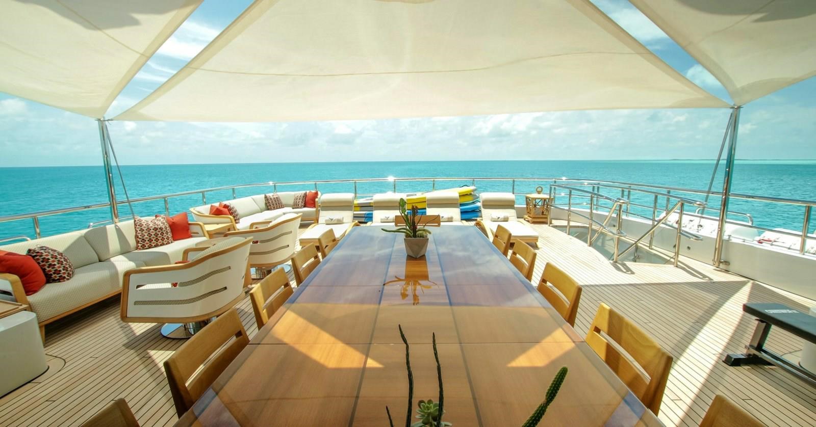 W boasts vast outdoor living areas, inviting guests to embrace the alfresco lifestyle. The sundeck serves as the heart of the yacht, perfect for basking in the sun. Enjoy multiple sunbathing spots, a large Jacuzzi, a shaded bar, and an outdoor dining area. Both the bridge deck aft and main deck aft are equipped with comfortable lounging areas ideal for social gatherings.